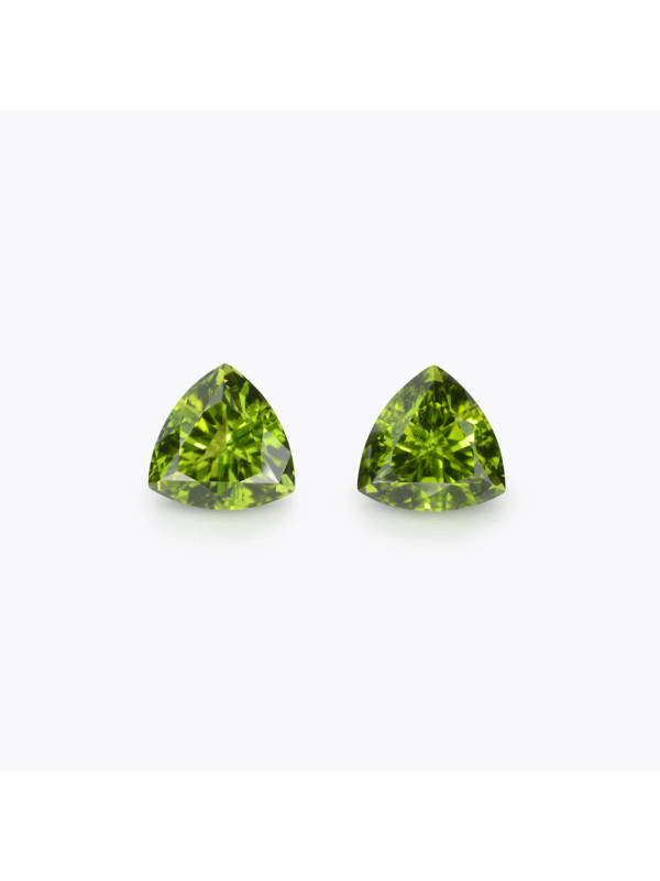 Pair of 2 yellow-green peridots trilliant cut 15.21 carats 12.60×12.60×7.90mm from Pakistan