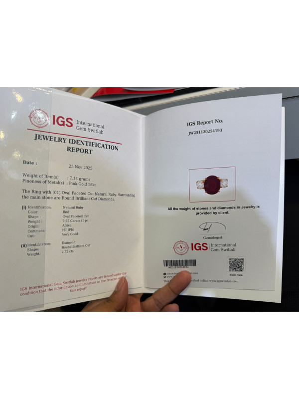 El anillo está engastado con un rubí sin calentar de aproximadamente 1,04 quilates, así como aproximadamente 0,60 quilates de diamantes. El rubí se corta en forma ovalada, mientras que los diamantes se cortan en forma redonda.