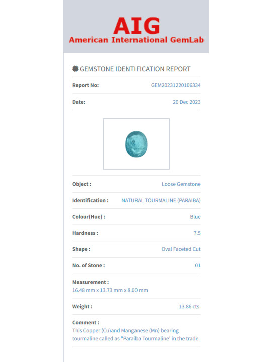 Tourmaline paraiba 13.86cts ovale 16.48x13.73x8.00mm du Mozambique certificat AIG