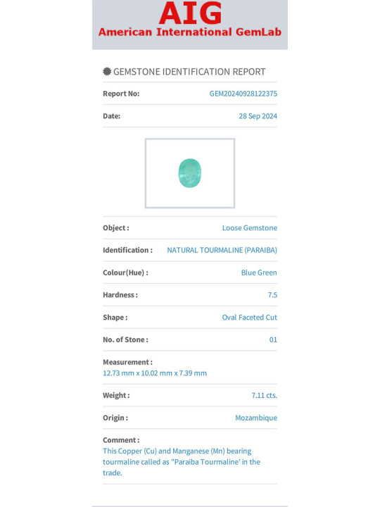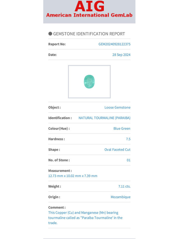 Tourmaline paraiba 7.11cts ovale 12.73x10.02x7.39mm du Mozambique certificat AIG