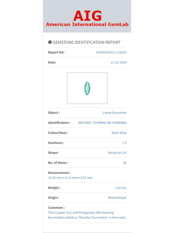 Tourmaline bleu paraiba 1.82cts taille marquise 13.52x6.13x3.57mm certificat AIG