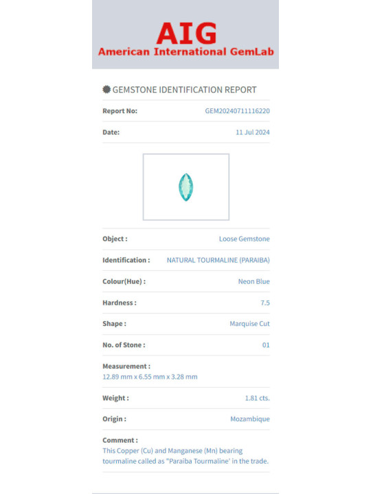 Tourmaline bleu paraiba 1.81cts taille marquise 12.89x6.55x3.28mm du Mozambique certificat AIG