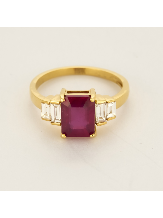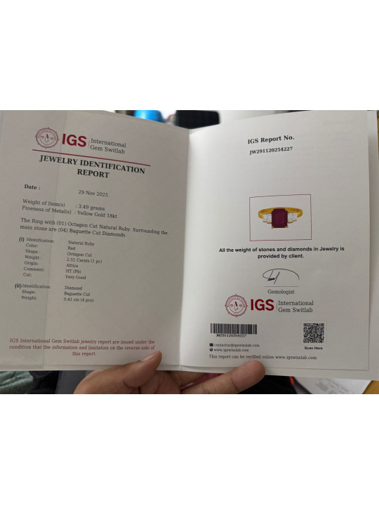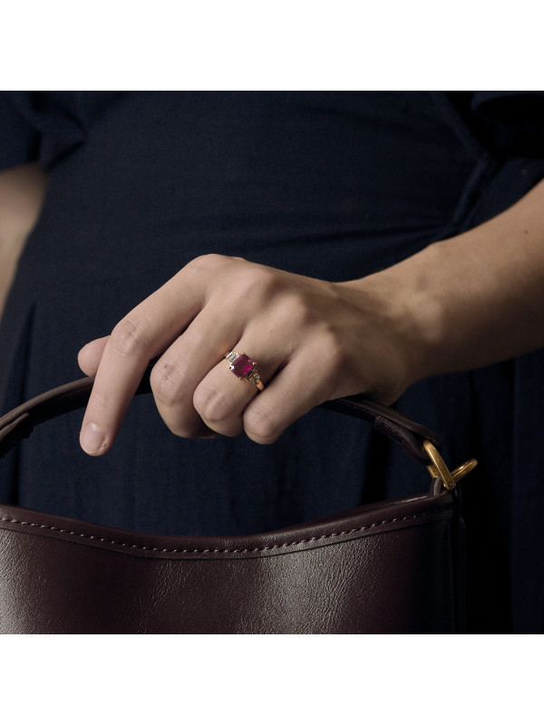L'anello contiene un rubino non riscaldato di circa 1,04 carati e circa 0,60 carati di diamanti. Il rubino è tagliato a forma ovale, mentre i diamanti sono tagliati a forma rotonda.