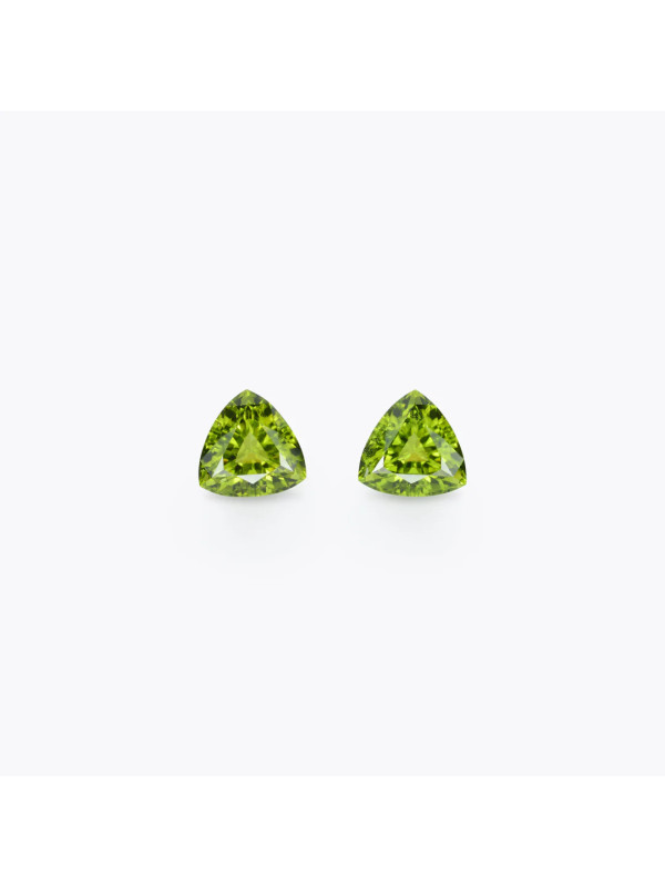 Coppia di 2 Peridoti verde giallastro 10,38 carati taglio trilliant 11.00x11.00x6.90mm dal Pakistan