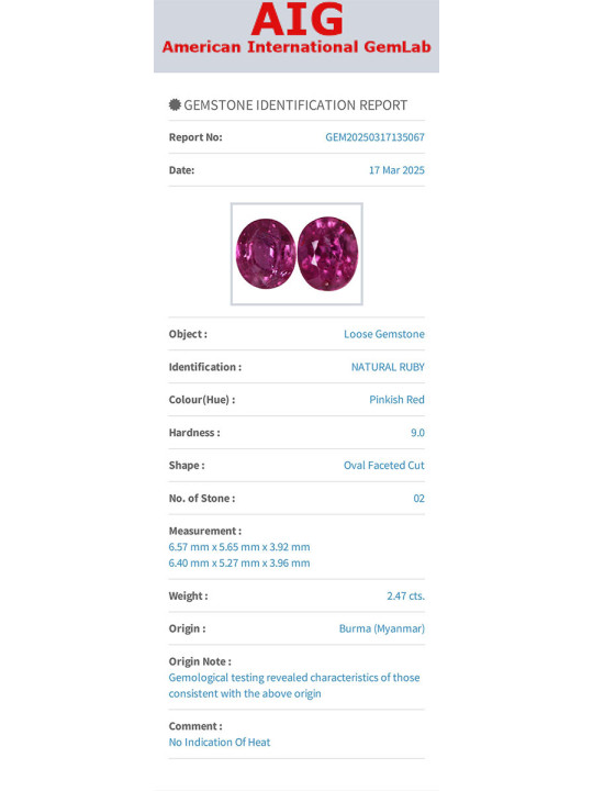 Coppia di rubini non trattati termicamente provenienti dalla Birmania, 2,47 carati, certificato AIG