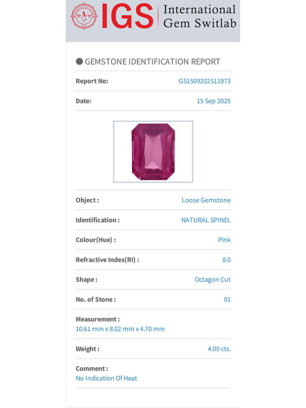 Spinello rosa 4,00 carati, rettangolare, 10,61 x 8,02 mm, proveniente dalla Birmania, certificato IGS