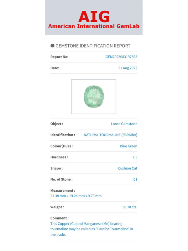 Tormalina paraiba 30,18 carati taglio cuscino 21,38x19,24x9,73 mm proveniente dal Mozambico certificato AIG