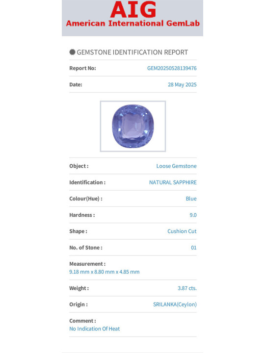 Zaffiro blu non trattato 3,87 carati, taglio a cuscino 9,18x8,80x4,85 mm dallo Sri Lanka, certificato FGL.